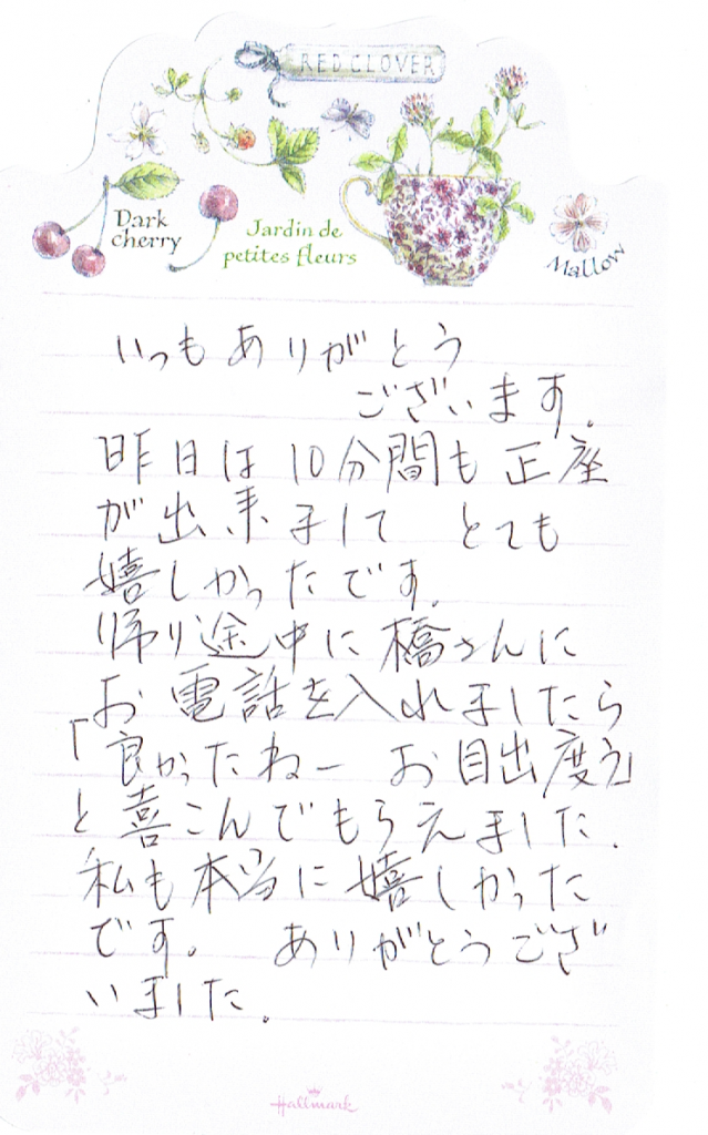 まずは10分正座が出来る様になったので、次は30分を目指し、末永く習い事を楽しめるようにしていきたいですね。