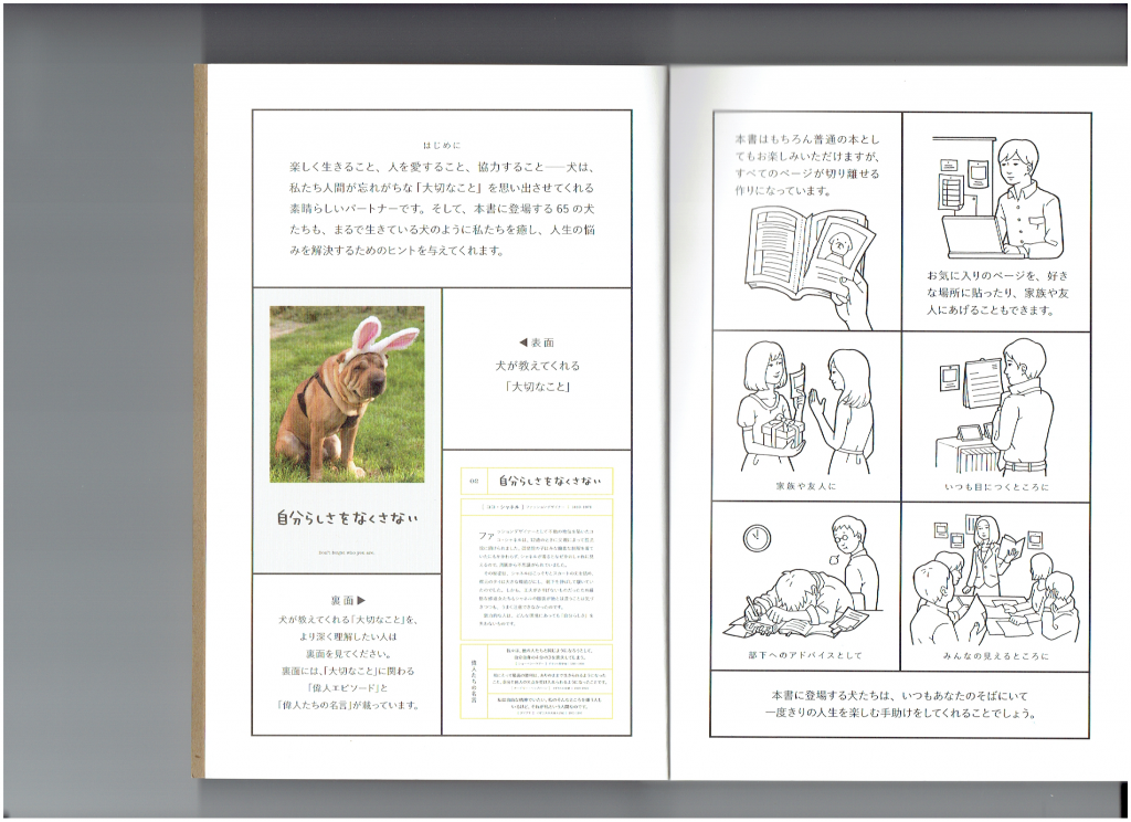 偉人達が残した65の名言がピックアップされていて、それぞれの名言になぞらえて65匹のワンちゃんがコスプレや表情でその名言を表現していて見て楽しめて、読んでタメになる面白い本です( *´艸`)