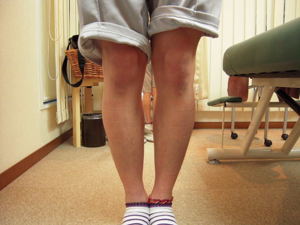 外重心。下半身の外側に体重がかかる状態が続き、脛の外側の筋肉が発達して内腿の筋肉が弱くなる。すると膝の下の骨(腓骨頭)が外に飛び出す様になり、O脚を形成するに至ります