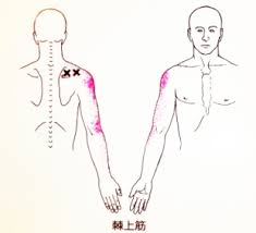 髪結い、帯結い動作に可動域制限があるものの、なんとか動かせる様子。一番症状がはっきり表れる動作は、腕を90°まで上げ、 肘を曲げた状態から 後方に少しねじると激痛が走る。腱板や肩周りを構成する筋肉組織に問題があると判断し施術方針を説明し、早期改善に向け施術に入る。 |